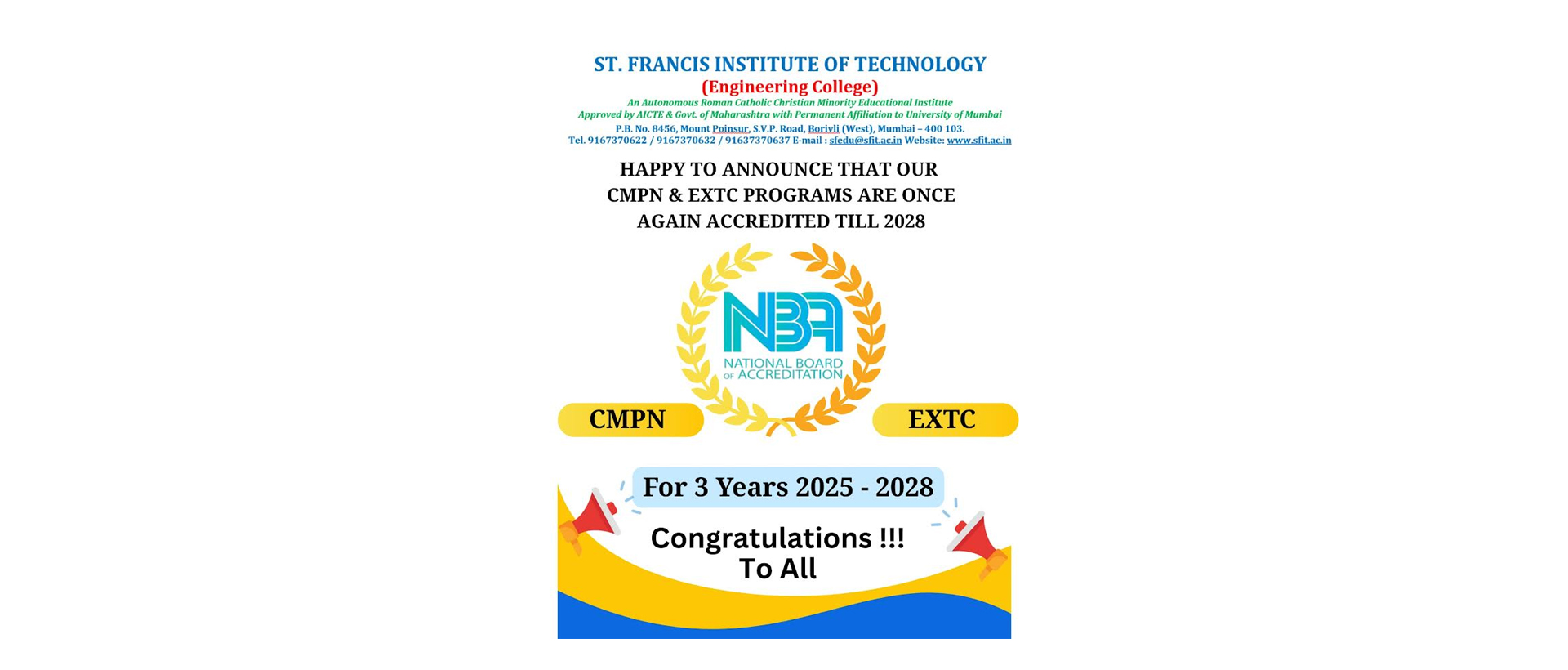 Advertisement for Vacancies of Adhoc Post of Assistant Professor & Lab Assistants - TERM II Academic Year 2024-2025 Institute Level Admission Notification and Registration Form for the AY 2025-2026 Alumni AGM Notice Scholarship 2025-26 MTech Admission Notification AY 2025-26 Undergraduate BTech Admission Notification AY 2025-26 Direct Second Year Admission Notification AY 2025-26 Change of Nomenclature of all Programs from academic year 2025-2026 Sanshodhan_2024 Ad-hoc Faculty Required in Computer/IT END SEMESTER EXAM Silver Jubilee Closing Ceremony Anti-Ragging Celebration Notice Maha DBT Scholorship 2023 Good News: SFIT IS CONFERRED AUTONOMOUS STATUS Change in College Contact Nos : +91 9167370622 / +91 9167370632 / +91 9167370637 ME Course in SFIT AY 23-24 - Awareness of facilities provided for BE Students Abhiyantra Project Video SFIT has been accredited at A+ Grade valid for a period of 5 years from 23/08/2022 by NAAC