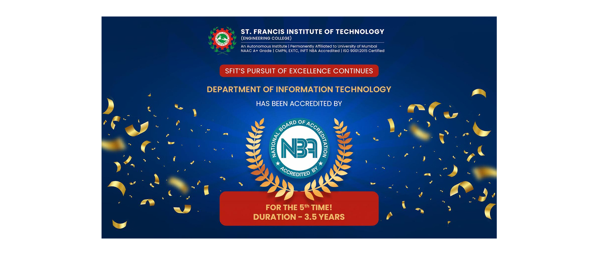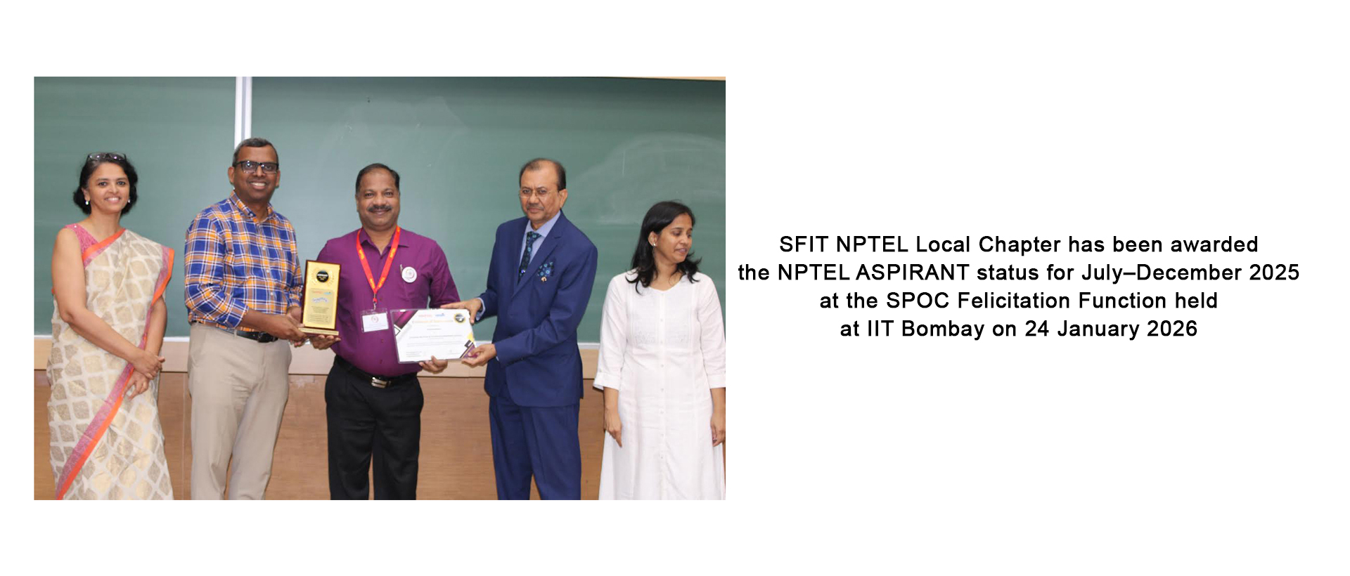 Advertisement for Vacancies of Adhoc Post of Assistant Professor & Lab Assistants - TERM II Academic Year 2024-2025 Institute Level Admission Notification and Registration Form for the AY 2025-2026 Alumni AGM Notice Scholarship 2025-26 MTech Admission Notification AY 2025-26 Undergraduate BTech Admission Notification AY 2025-26 Direct Second Year Admission Notification AY 2025-26 Change of Nomenclature of all Programs from academic year 2025-2026 Sanshodhan_2024 Ad-hoc Faculty Required in Computer/IT END SEMESTER EXAM Silver Jubilee Closing Ceremony Anti-Ragging Celebration Notice Maha DBT Scholorship 2023 Good News: SFIT IS CONFERRED AUTONOMOUS STATUS Change in College Contact Nos : +91 9167370622 / +91 9167370632 / +91 9167370637 ME Course in SFIT AY 23-24 - Awareness of facilities provided for BE Students Abhiyantra Project Video SFIT has been accredited at A+ Grade valid for a period of 5 years from 23/08/2022 by NAAC